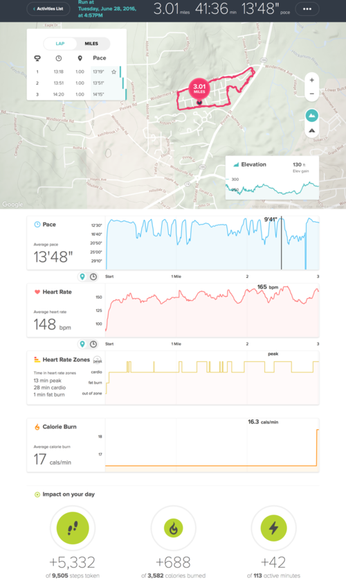 I kept a fairly steady pace for a while, and then walked for portions. I watched my heart rate jump up and down as I sped up and slowed down. I was running on a trail around my community which has varied elevations, a mixture of dirt/gravel and pavements, and generally is a clear shot. It is 1.5 miles around the trail. After the first loop was completed in about 20 minutes, I almost gave up. Then I looked at my Fitbit and realized that if I didn’t keep going, I’d never make those 10,000 steps for today. So I did another lap around and ended up at 3 miles total.